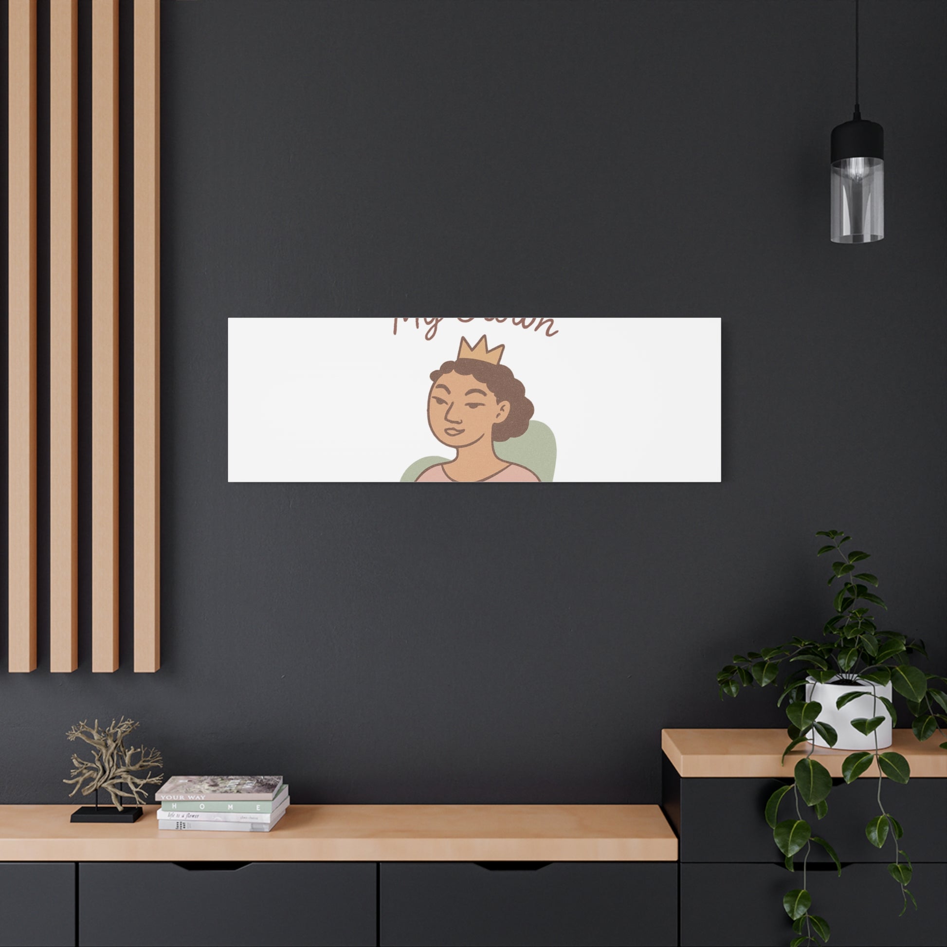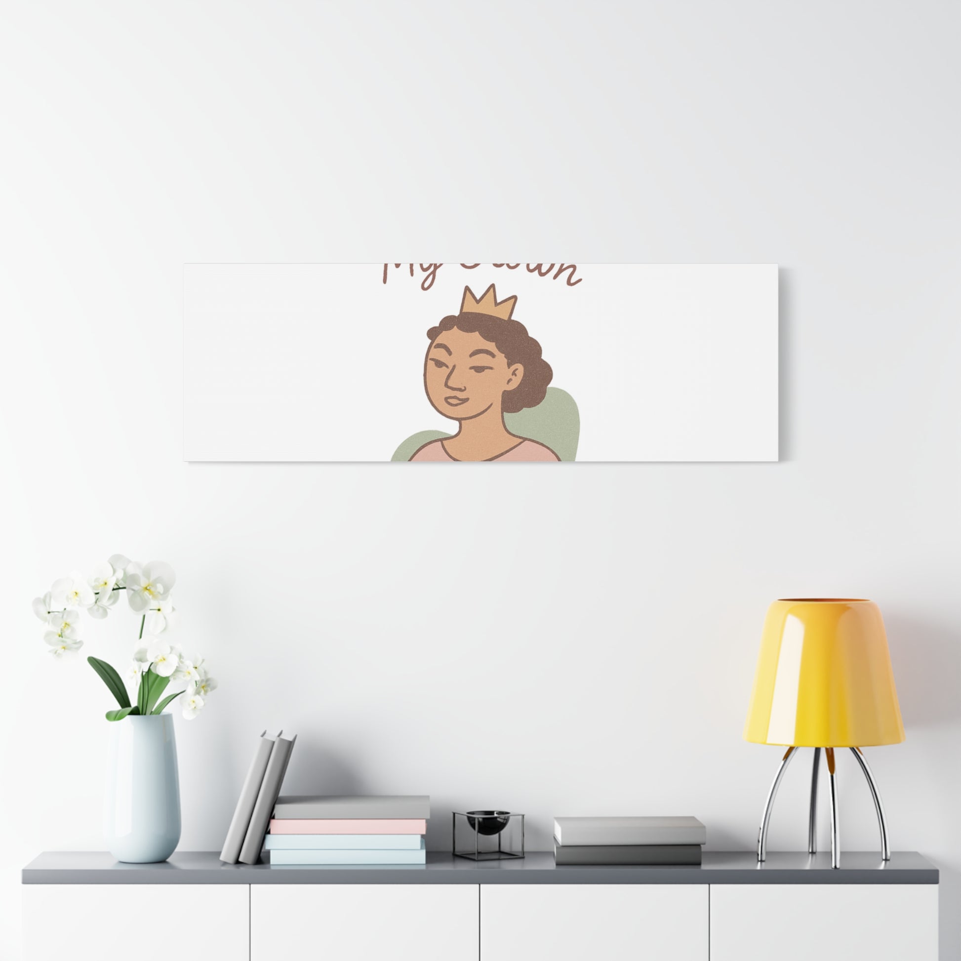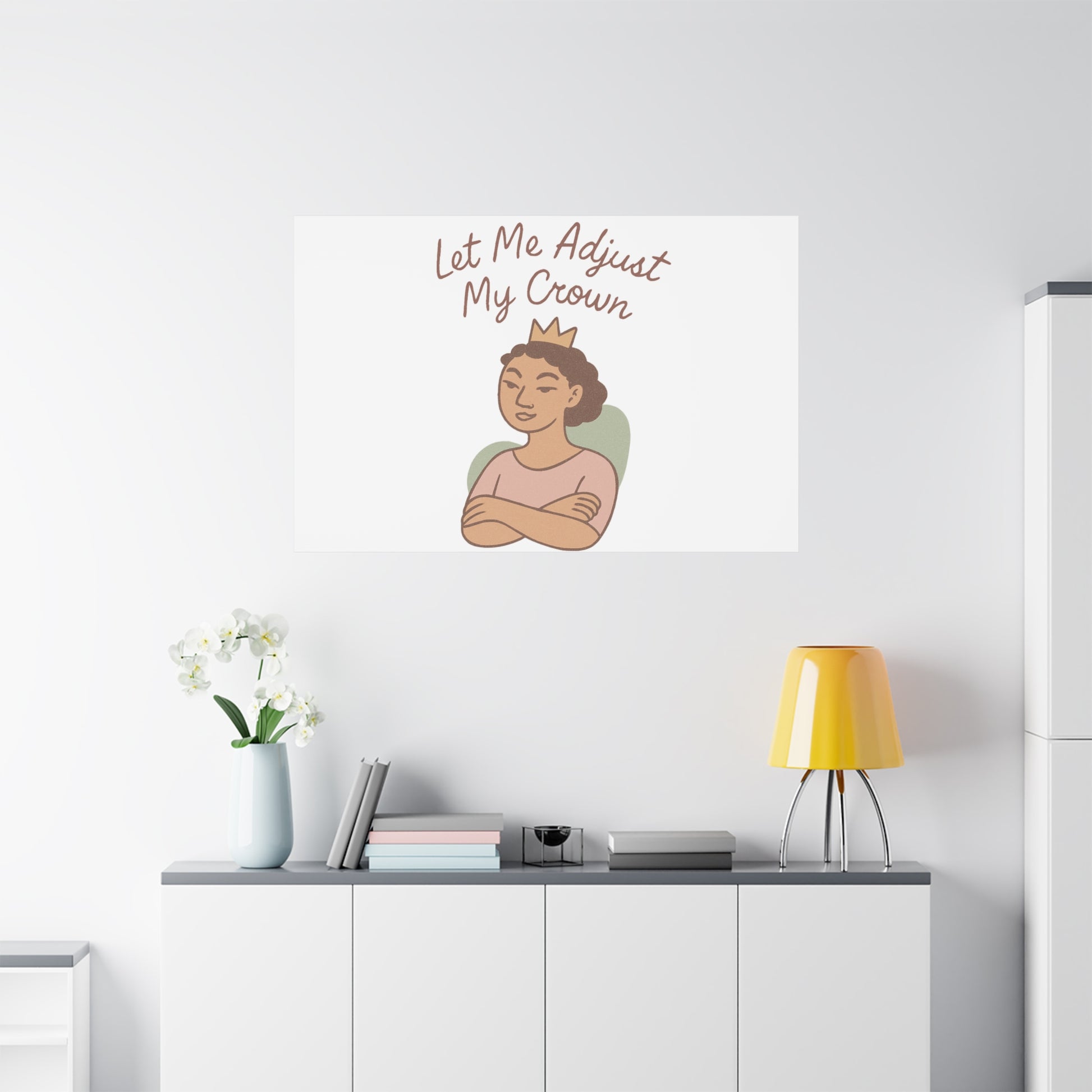 This stretched matte canvas features a confident, hand-drawn portrait beneath the phrase “Let Me Adjust My Crown.” Quiet, warm colors and soft linework give it a gentle, empowering presence that blends into both modern and cozy interiors. The image is printed with UL-certified Greenguard Gold latex inks for a vivid, non-toxic finish on a cotton-poly canvas stretched over sustainably sourced radiata pine. Lightweight but sturdy, it arrives ready to hang with back-hanging hardware and small rubber dots on the lower back corners to keep it level and secure. Choose from multiple orientations and sizes to fit a bedroom wall, home office, or entryway where it can offer a subtle daily reminder of self-respect and calm confidence.